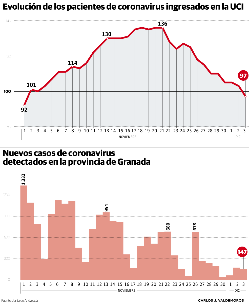 Buenas noticias para Granada en cuanto al descenso de pacientes graves de Covid-19. La provincia registra menos de 100 ingresados en UCI por ... primera vez en un mes. Concretamente la Consejería de Salud y Familias notifica este jueves 3 de diciembre que la provincia mantiene 425 personas hospitalizadas, de las que 97 están en UCI. Para encontrar una cifra por debajo del centenar de ingresos hay que remontarse al pasado 1 de noviembre, cuando se registraron 92.