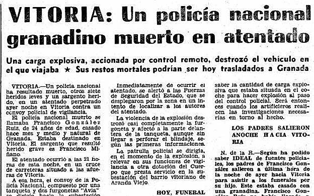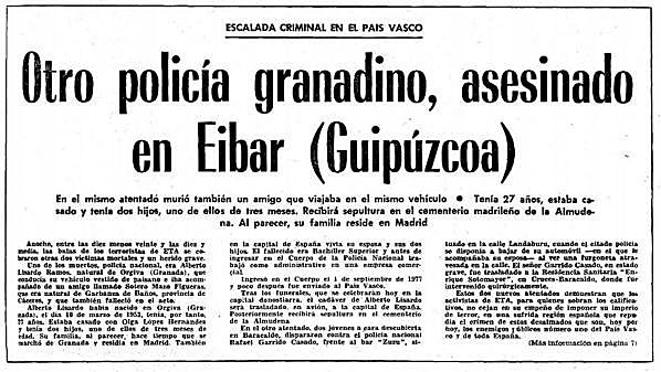 El policía nacional Alberto Lisardo Ramos murió ametrallado en la villa guipuzcoana de Eibar junto a un peluquero. Alberto tenía 27 años, era de Órgiva, estaba casado y tenía dos hijos, uno de ellos de tres meses.