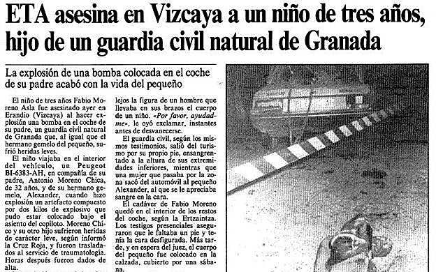ETA asesina en Erandio al niño de dos años Fabio Moreno Asla, que es hijo de un guardia civil granadino: Antonio Moreno Chica. El padre y hermano gemelo del pequeño fallecido sólo sufrieron heridas leves. Los terroristas habían colocado dos kilos de explosivo bajo el asiento del copiloto del vehículo familiar.