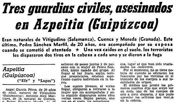 El guardia civil granadino Juan Maldonado Moreno es asesinado en la localidad portuaria de Pasajes de San Juan (Guipúzcoa) con una bomba adosada a su vehículo.