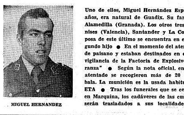 El guardia civil Miguel Hernández Espigares, accitano de 23 años, falleció acribillado junto a otros tres compañeros en el pueblo vizcaíno de Marquina. Les dispararon mientras comían vestidos de paisano en un restaurante de la citada localidad. Antes de ingresar en el instituto armado, Miguel trabajaba en el campo. Aunque nació en Guadix, él y su familia residían en Alamedilla.