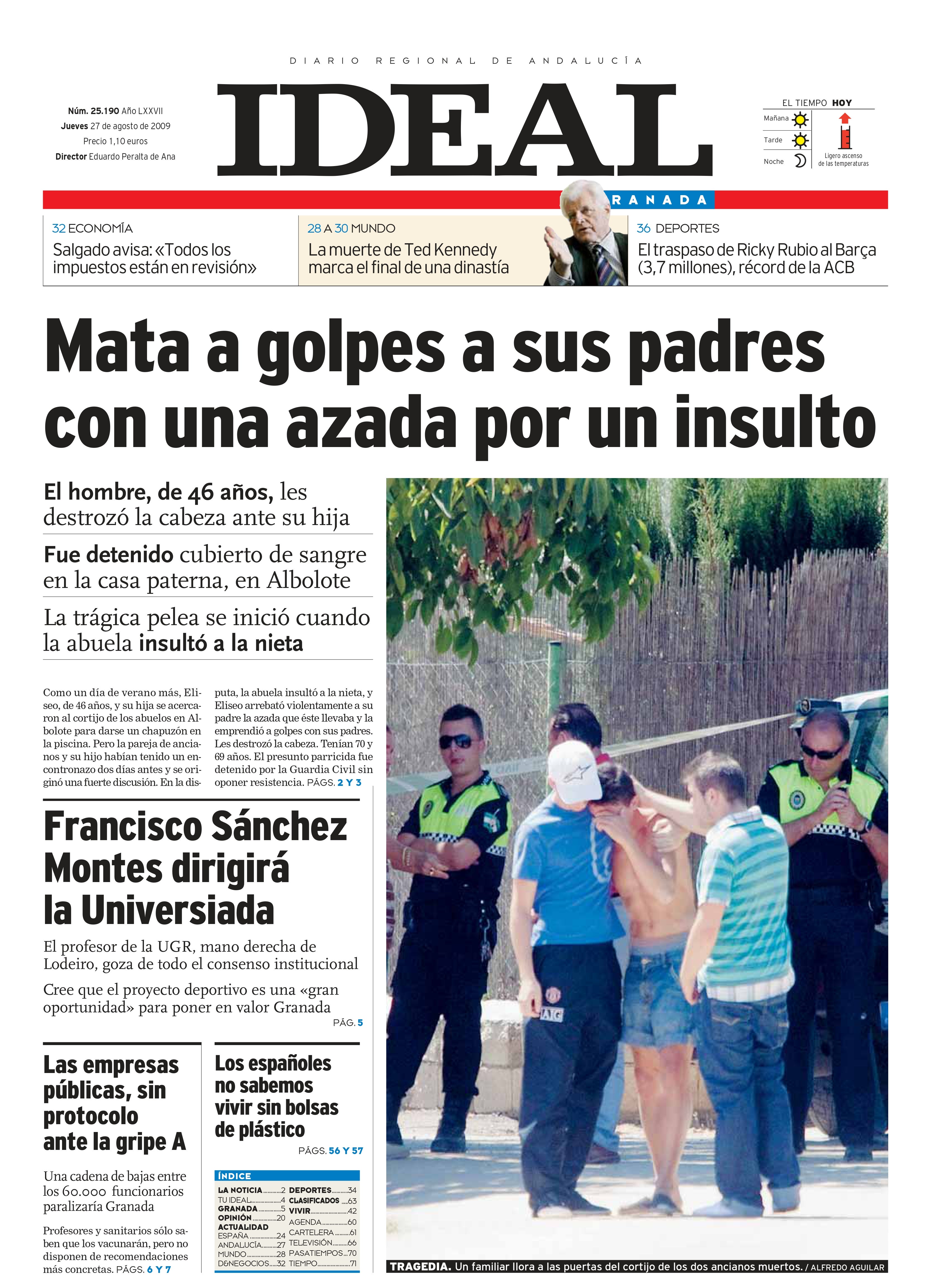 Iba a ser una visita para zanjar relaciones familiares. El vínculo se había roto. Ese miércoles, 26 de agosto de 2009, fue la última visita ... de Eliseo, de 46 años, a casa de sus padres, ubicada en el pago 'La Joya', a las afueras del municipio granadino de Albolote. Le acompañaba su hija, la nieta del matrimonio que desde entonces descansa en paz. La crónica escrita en las páginas de la edición de IDEAL que aterrizó a la mañana siguiente en los bares y quioscos contó que la pareja de ancianos y su hijo habían tenido un encontronazo dos días antes.