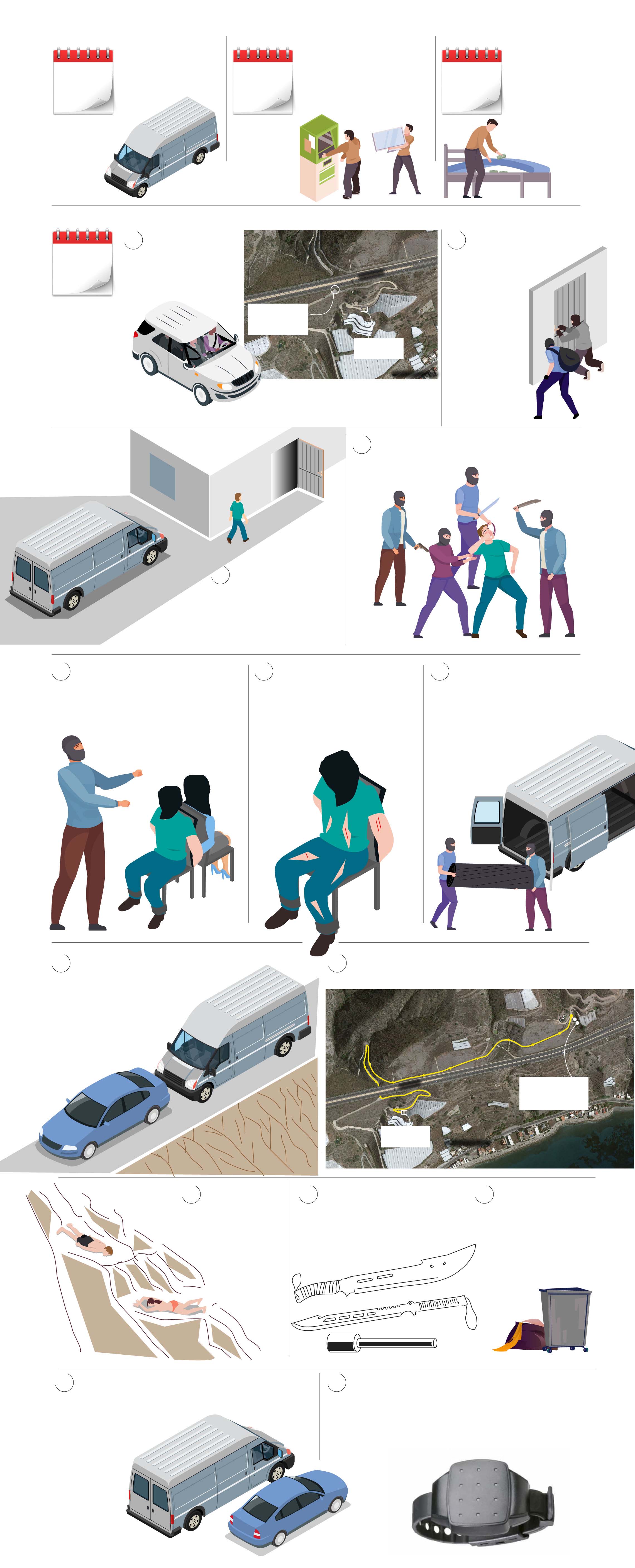 Los dos asesinatos se cometieron en el baño. Luego, los asaltantes envolvieron sus cuerpos semidesnudos en sábanas y una manta, y los introdujeron en la furgoneta de José.