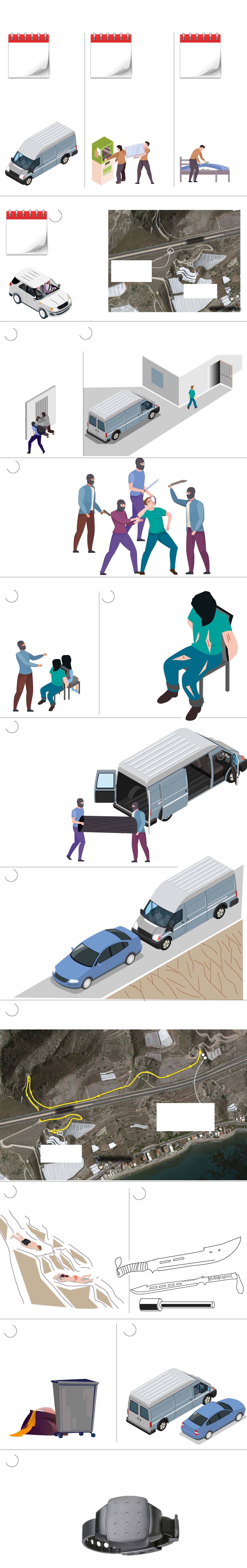 Sobre las 0.00h, los asaltantes abanadonan la finca montados en los vehículos de las víctimas con los cuerpos en la furgoneta. Buscan un lugar donde deshacerse de los cadáveres