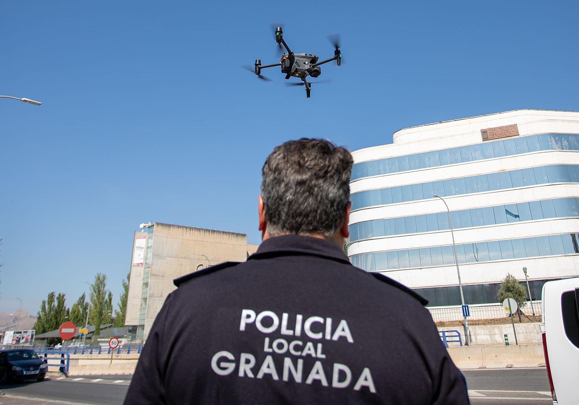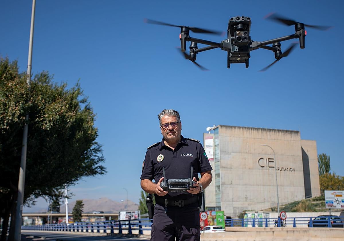 La Policía Local de Granada utiliza este valioso instrumento desde la pandemia para distintas funciones. Su calidad de imagen, rapidez y tecnología ofrece al cuerpo policial múltiples posibilidades. A la hora de controlar el tráfico, Jorge y sus drones trabajan de forma independiente. Se elige un punto y se monta el dispositivo para la vigilancia de la circulación de vehículos. El dron de la policía es casi indetectable. No hay luces azules ni chalecos amarillos. Pero este policía lo deja claro: «No vamos a pillar. Nuestro objetivo no es multar por multar y la mayoría de las veces soy bastante permisivo y comprensivo ante posibles infracciones». Jorge enciende el dron, señala un punto conflictivo a nivel circulatorio y desde el aire capta todas las matrículas para comprobar la documentación, a la vez que vigila alguna actitud sancionable de los conductores.