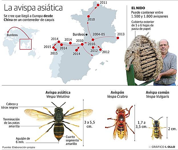 «Lo peor de la avispa asiática es que atacan a las colmenas comiéndose a las abejas. Lo hacen cuando van a entrar o salir de la colmena y en ocasiones impiden a las abejas salir con el consecuente daño para la apicultura», explica este doctor en Veterinaria. Montan sus colmenas en árboles muy altos a quince o veinte metros y de ahí la dificultad para erradicar sus panales. Oficialmente no está confirmado si se trata o no de una avispa asiática, hasta que Medio Ambiente se pronuncie.