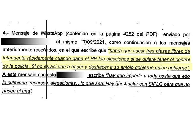 Por su parte, algunos mensajes de los policías hacen referencias despectivas sobre la edil socialista, Raquel Ruz, y José Antonio Moreno, exjefe de la policía durante el mandato de Cuenca. Por último, la UDEF ha encontrado un mensaje fechado el 17 de septiembre de 2021 con peticiones de un oficial a Díaz de futuras convocatorias «cuando gane el PP». «Habrá que sacar tres plazas libres de intendente rápidamente cuando gane el PP las elecciones si se quiere tener control de la policía. Si no es así van a hacer y deshacer a su antojo gobierne quien gobierne». «Hay que impedir a toda costa que eso lo culminen, recursos, alegaciones... Hay que hablar a SIPLG para que no pase ni una», sentencian mensajes de dicho grupo.