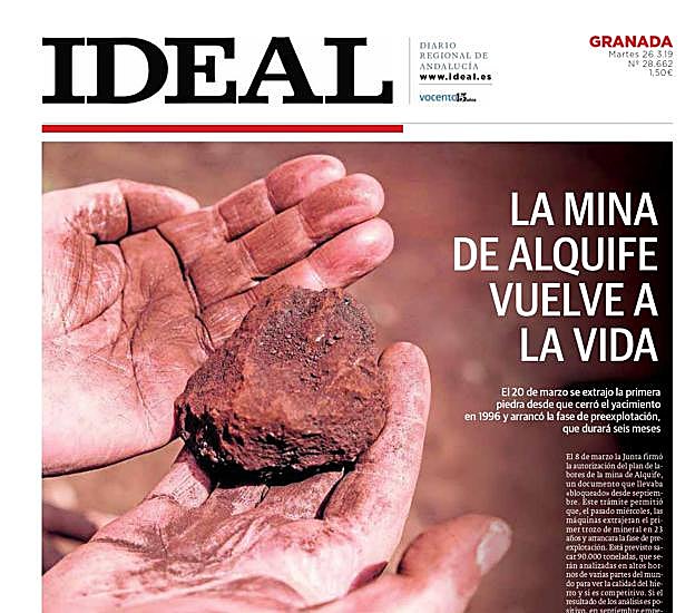 La portada del periódico IDEAL del pasado martes 26 de marzo devolvió la esperanza a toda la comarca del Marquesado y de Guadix. Con el título «La mina de Alquife vuelve a la vida», se mostraba una fotografía a toda página de dos manos que muestran una piedra, todo envuelto en una atmósfera rojiza que todos los que conocen Alquife saben que es el color de su tierra.