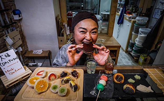Los domingos –y no todos los domingos–, la panadería Al Alba desaparece y se transforma en Kame, una pastelería de dulces japoneses. Un pequeño espejismo casi espectral que, como en los cuentos clásicos del misterioso oriente, hechiza un lugar y a sus gentes desde la más absoluta normalidad. Reiko Shinozaki (Tokyo, 48 años) es una maestra del wagashi, la palabra que define el arte milenario de hacer dulces japoneses. Ella, a través de su cuenta de Instagram (kame.wagashi), avisa de los productos que llevará a la tienda: dorayakis, mochis, rakugan, dangos... Ese domingo abre de 11.00 a 15.00 de la tarde. «Pero lo cierto es que, a las doce, ya está casi todo vendido», ríe divertida en el interior del obrador.