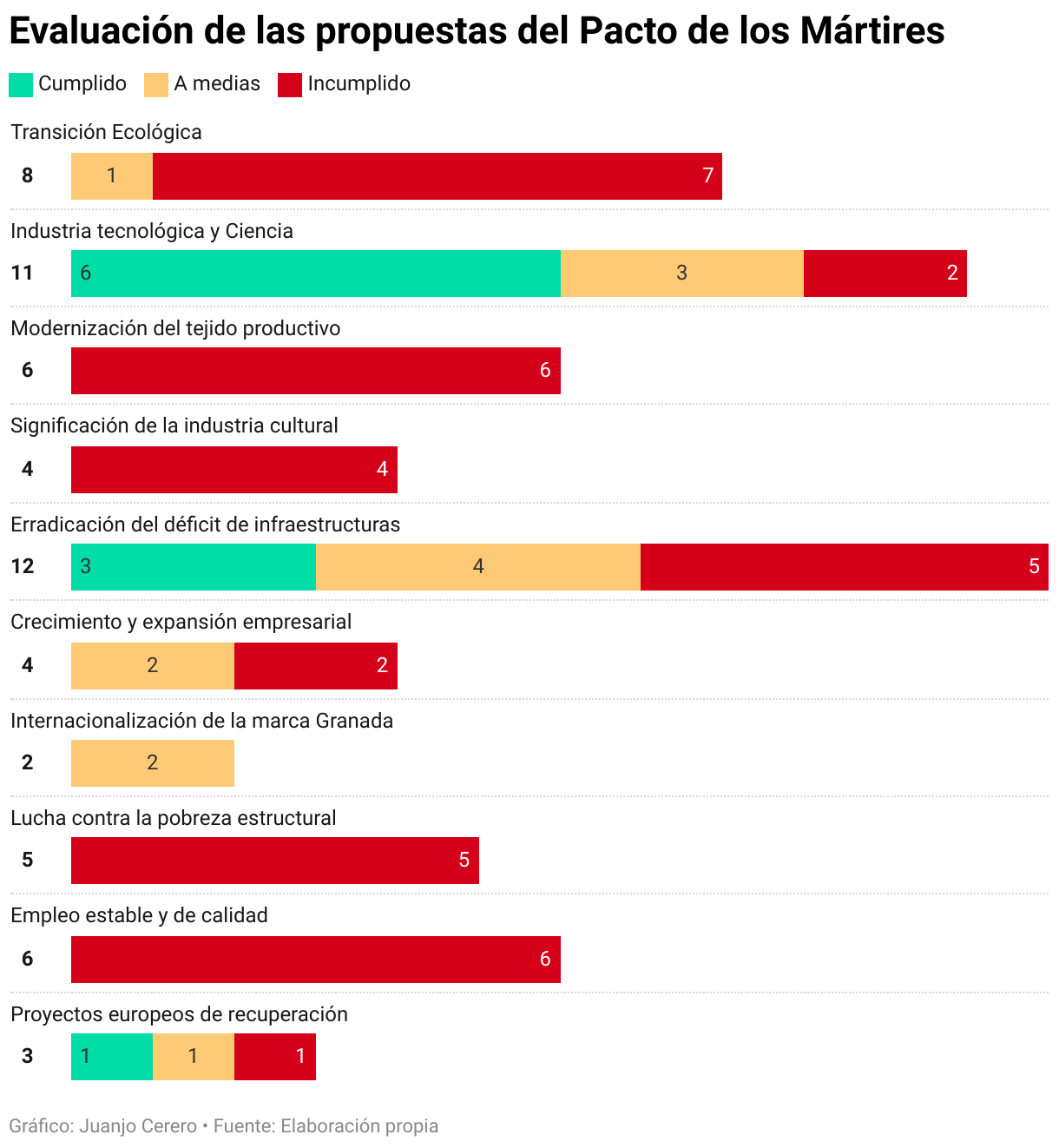 Un año después, el análisis del trabajo realizado revela que más de la mitad del acuerdo no solo no se ha ejecutado sino que ni siquiera se ha abordado en las ocho reuniones que se han mantenido hasta el momento. Apenas 11 de las 61 iniciativas pueden darse por completadas, la mayoría vinculadas con el desarrollo de un modelo productivo basado en la industria del conocimiento, la tecnología y la ciencia. Entre las mismas están el apoyo a la construcción del acelerador de partículas, la habilitación de mejores conexiones con Escúzar, el incentivo económico para la constitución de 'hubs', la ampliación de la oferta formativa de tecnologías disruptivas, el desarrollo de actuaciones de fomento de estos sectores o la consolidación de Granada como referente en IA.
