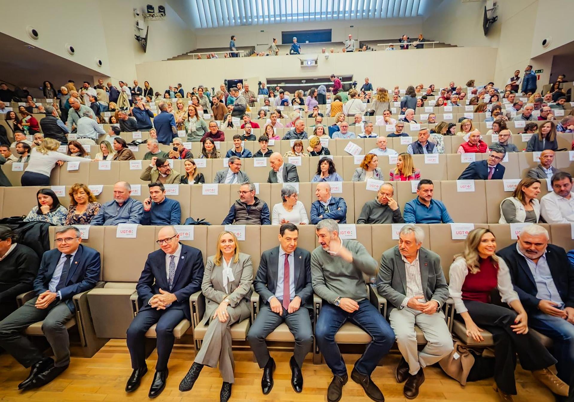 El presidente de la Junta intervino así en el Congreso que, desde ayer, reúne en Granada a 302 delegados que representan a los afiliados de toda Andalucía y en el que el actual secretario andaluz de UGT, Óskar Martínez, revalidará su liderazgo. El congreso contó con un fuerte respaldo institucional ya que al paraninfo del PTS acudieron numerosos invitados del ámbito político, sindical, social y empresarial. Tuvieron intervenciones el rector de la Universidad de Granada, Pedro Mercado; el subdelegado del Gobierno en Granada, José Antonio Montilla; la alcaldesa de Granada, Marifrán Carazo; la vicepresidenta cuarta de la Diputación de Granada, Mónica Castillo, el presidente de la Confederación de Empresarios de Andalucía, Javier González de Lara y la secretaria general de CC OO Andalucía, Nuria López. El presidente del Consejo Económico y Social de Andalucía, Juan Marín, el secretario segundo de la mesa del parlamento de Andalucía, Noel López, los representantes del PSOE provincial y alcaldes de distintos ayuntamientos, el exsecretario de UGT en España Cándido Méndez y el delegado de la Junta, Antonio Granado junto a otros delegados territoriales estaban también entre los asistentes.