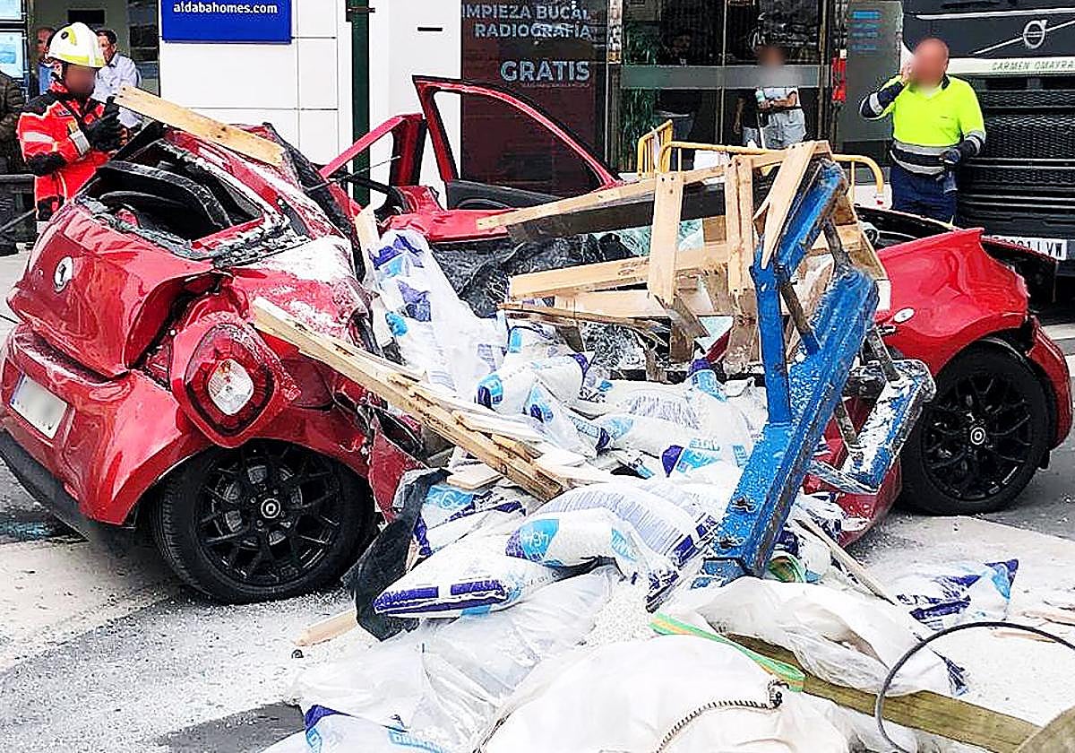 Una mujer salva la vida tras caer un palé de sacos de cemento encima de su coche en ArabialLos servicios sanitarios le han colocado un collarín a la conductora después de que haya salido prácticamente ilesa de este suceso