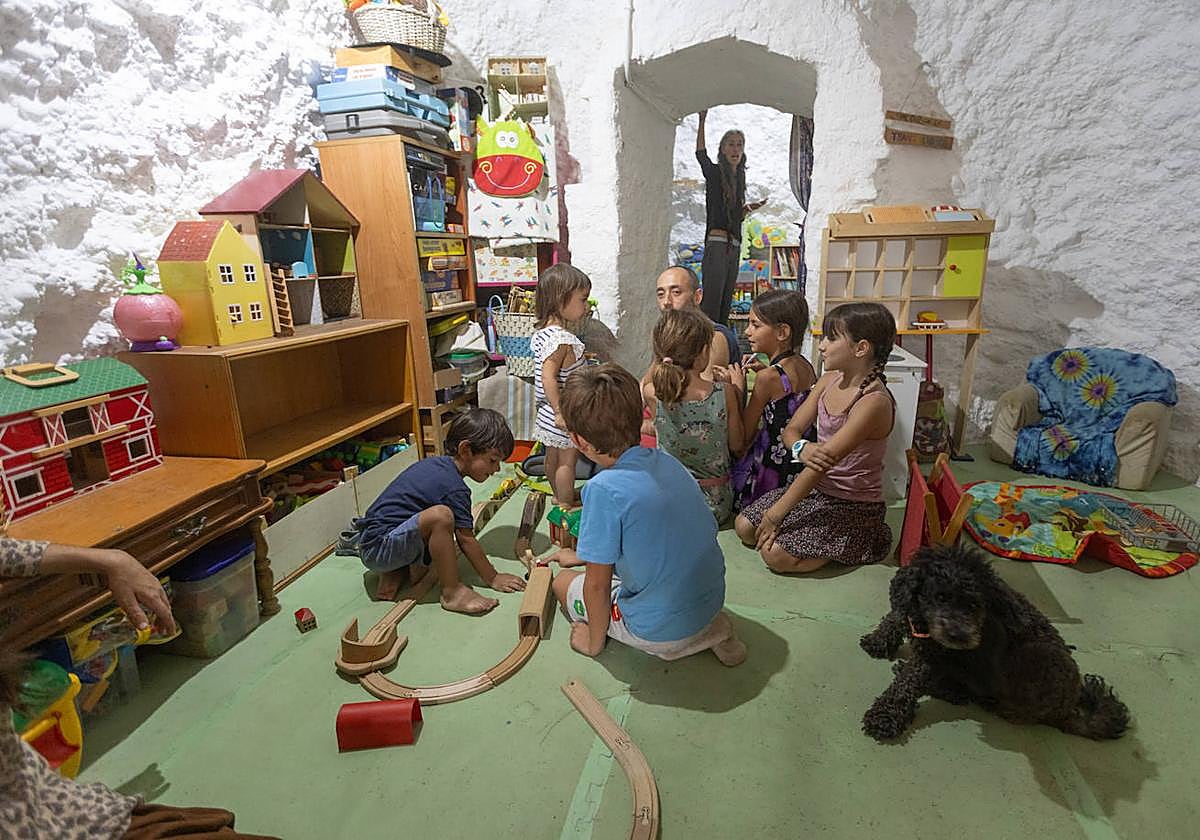En el interior, Nalah juega con otros peques. Los techos bajos y las paredes de cal llaman la atención de todo el que no frecuente cuevas. Los zapatos están prohibidos. Los niños andan descalzos, muy entretenidos con un antiguo tren de madera. En la habitación de al lado, Óscar trastea con una pequeña pizarra. A sus ocho años, parecen fascinarle los dibujos que aparecen en la pantalla. Aunque pantallas de verdad, en La Escuevita, ninguna.