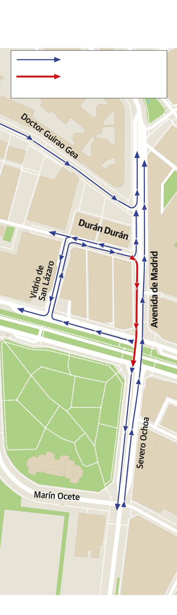 La propuesta municipal es sencilla. Los coches que vengan desde Emilio Durán podrán ahora girar a izquierda, como hasta ahora, para subir la avenida o hacia la derecha para cruzar a Severo Ochoa. Eso hará que en ese primer tramo de la arteria convivan los dos sentidos. La medida permitirá que aquellos que suban de Constitución por Vidrio de San Lázaro puedan dar el salto a Severo Ochoa. Lo mismo podrán hacer quienes desemboquen de alguna de las calles del barrio en Emilio Durán.