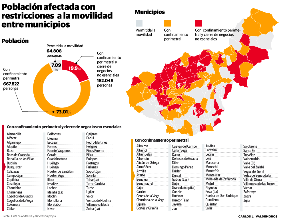 La situación en la mayoría de municipios de Granada es muy delicada. El virus está aumentando su presión y a partir de mañana ya serán ... 119 los pueblos que tendrán que confinar sus fronteras. Entre todos aglutinan el 93% de la población de una provincia que ve con mucha preocupación la deriva que está tomando la pandemia.