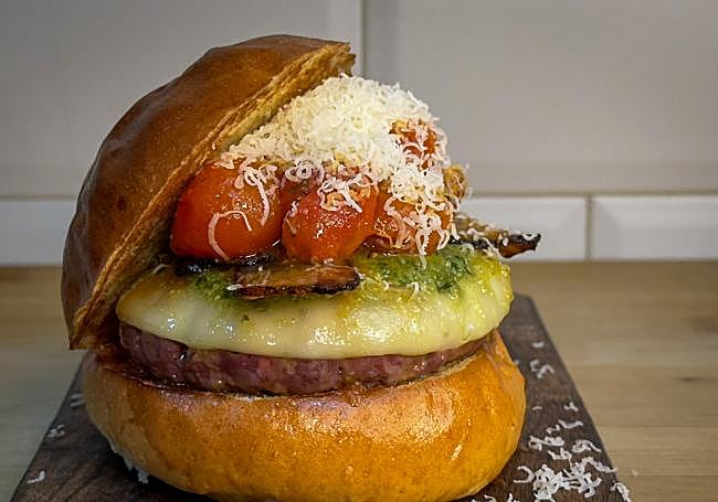 En Burger Lover, hamburguesería de Salobreña, han preparado para el concurso a la 'Caprese', una hamburguesa de pan brioche artesanal, medallón vaca rubia gallega madurada, queso mozzarella, pesto de almendra, guanciale, cherrys confitados con hierbas aromáticas y nube de queso parmesano.