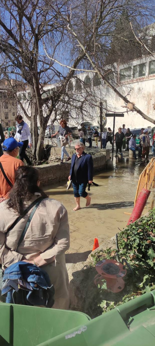 Las obras en una tubería inundan un puente en el Paseo de los Tristes de Granada