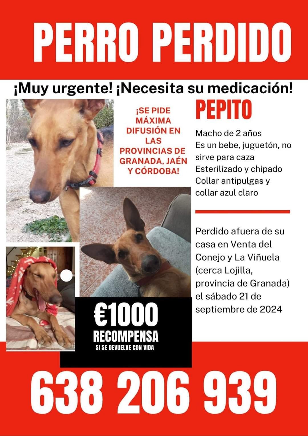 Natalie es belga pero lleva instalada en la provincia de Granada desde el 2008. En su cortijo, muy cerca de Lojilla, situado en la frontera ... entre las provincias de Jaén, Granada y Córdoba, conviven varios perros, pero había uno muy especial al que le perdió la pista el pasado día 21 de septiembre. Pepito, que así se llama el can, salió del recinto y no volvió. Algo «muy extraño», señala su dueña, pues cada mañana corría al campo a dar su paseo «entre las ocho y las once de la mañana» y volvía a casa como un reloj, «sin necesidad de salir a buscarlo».