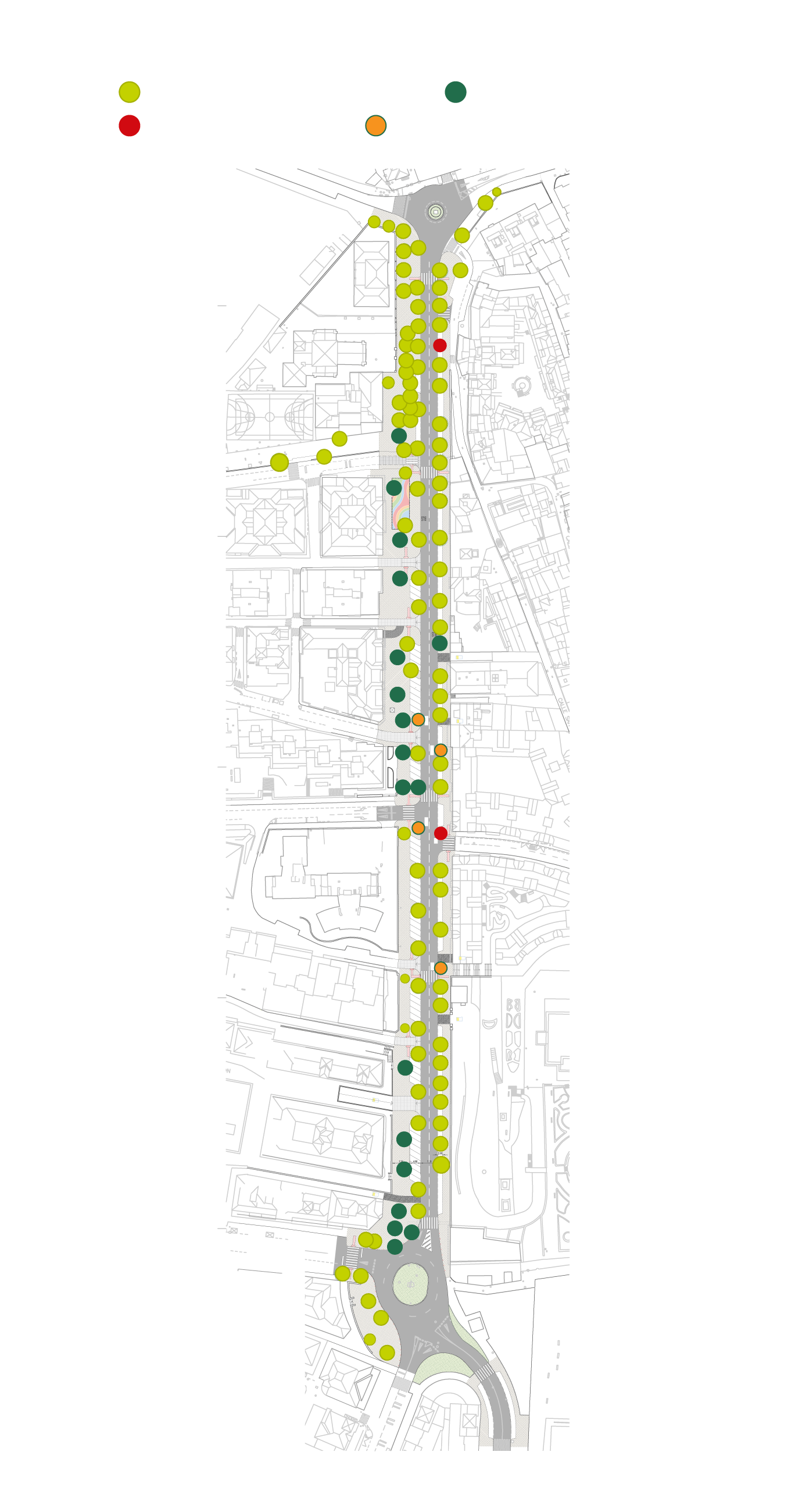 En el plano de la actuación de Cervantes se detalla que esta calle se pasará de 102 a 104 estacionamientos. Además, habrá 117 árboles, que son más de los que hay actualmente. Y es aunque dentro de la intervención se contempla la eliminación de siente de estos árboles, se incorporarán 22 nuevos, algunos ubicados en el mismo emplazamiento de los que se quitan, según el Consistorio, «por razones de seguridad».