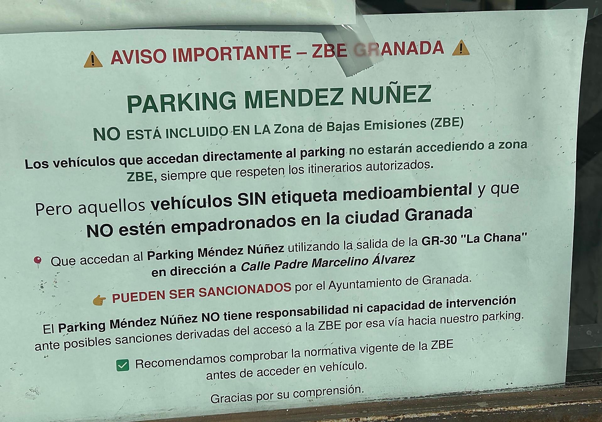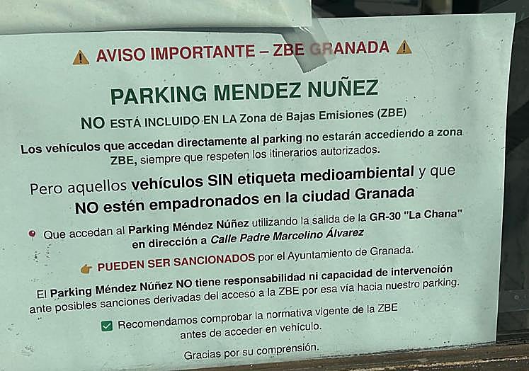 El parking de Méndez Nuñez, al límite de la zona de bajas emisiones. Un cartel en la puerta del aparcamiento público llama la atención: «Los ... vehículos que acceden directamente al parking no estarán accediendo a la zona ZBE, siempre que respeten los itinerarios autorizados». ¿Qué significa eso? Que depende de por dónde se acceda al parking las consecuencias podrán ser unas u otras para los vehículos no matriculados en Granada y sin etiqueta medioambiental.