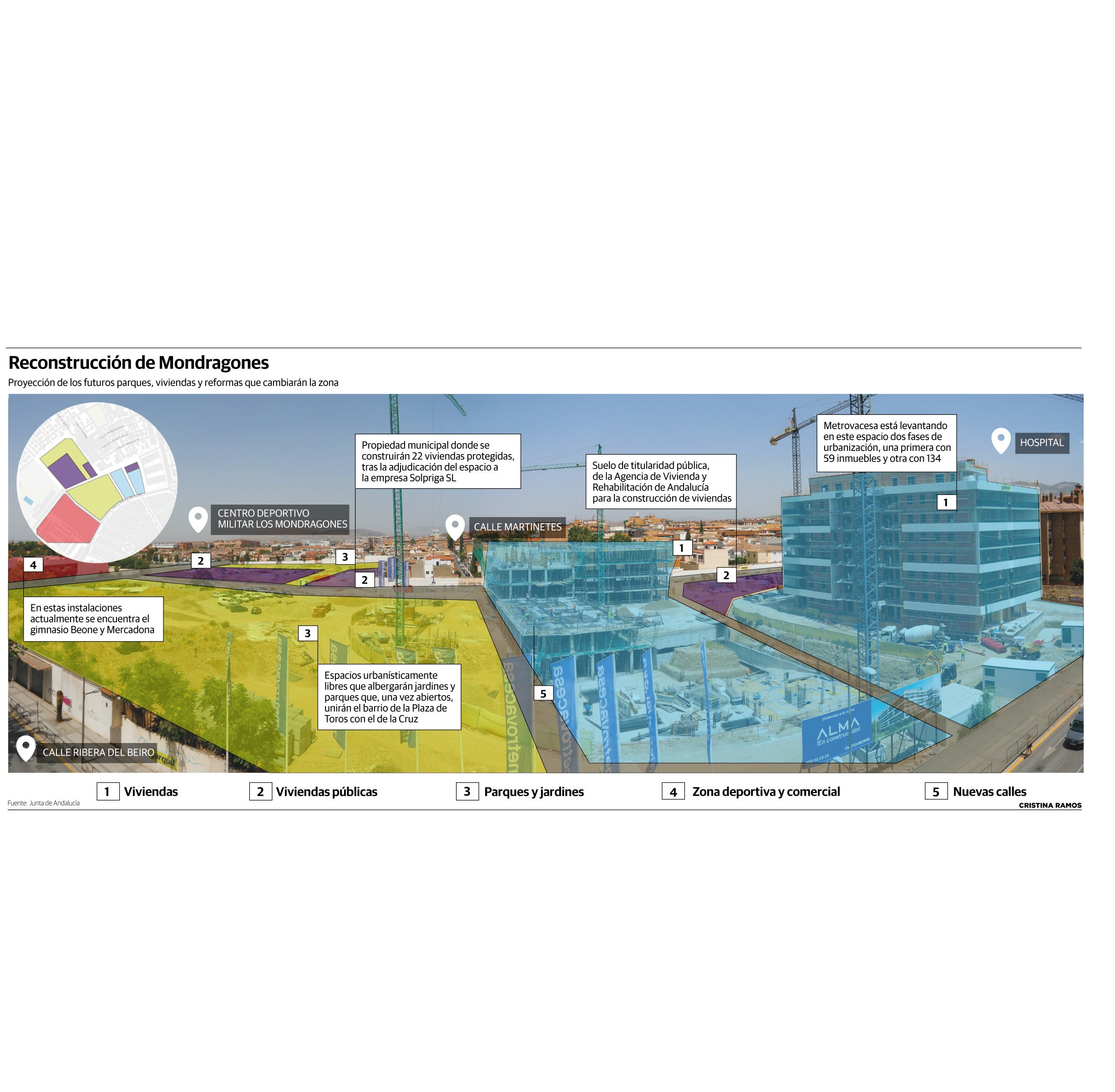 Hay que remontarse a principios de los 2000, para recordar cuando los vecinos de los barrios que colindan con los antiguos cuarteles ya pedían el derribo del muro que permitiera la unión. Fue en 2007, cuando el Ayuntamiento de Granada presentó el proyecto del complejo administrativo de Mondragones, en el que ya se incluía la futura construcción de viviendas, así como la apertura de un gimnasio, nuevos viales y varias zonas verdes.