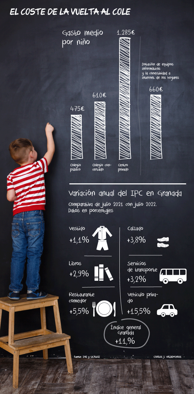 Vivir y consumir en Granada es un 11,1% más caro que hace un año. Según el INE, los productos que afectan a la vuelta al cole han subido entre un 1% de la ropa hasta más de un 15% del vehículo privado, por el que optan muchas familias para ahorrarse el coste del transporte escolar.
