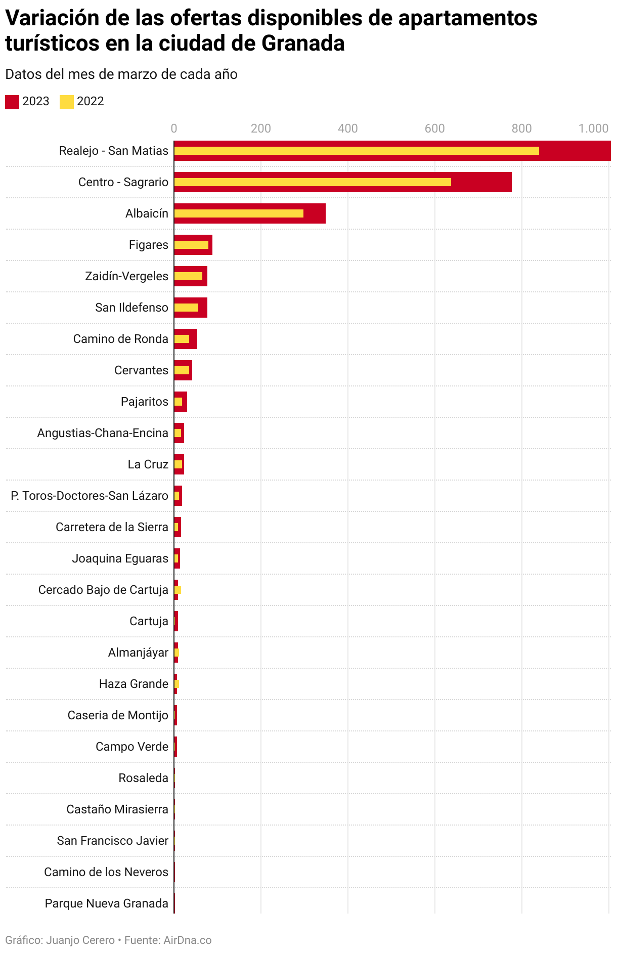 El mercado de alquileres turísticos en Granada ha experimentado un incremento del 22% con respecto al año pasado (2022), con una creciente tendencia en la mayoría de los barrios de la ciudad, especialmente en el centro. En un año, en la capital, se ha pasado de 2.196 a 2.667, según los datos de AirDna, empresa de análisis de mercado de este sector. La ocupación se ha mantenido estable en barrios como Albaicín, mientras que ha experimentado un aumento en las zonas de Realejo-San Matías y Centro. Los apartamentos están bastante concentrados y estos barrios acogen el 80% de todos los pisos turísticos de la ciudad.