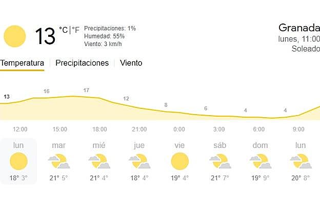 De acuerdo con la previsión de la Agencia Estatal de Meteorología (Aemet), Granada tendrá este lunes una mínima de 3 y una máxima de 18 grados. Se trata de una temperatura elevada para estar en pleno invierno, pero es que, además, es la más baja que habrá en toda la semana.