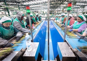 Las líneas de la cooperativa de espárragos Los Gallombares de Loja recuerdan a las imágenes de aquellos antiguos anuncios de United Colors of Benetton que reunían a personas de distintas edades, razas y nacionalidades para hacer una oda a la diversidad y la multiculturalidad. El inicio de la campaña del espárrago verde ha convertido el gran almacén de diez mil metros cuadrados en una pequeña ONU en la que se escucha hablar indistintamente en árabe, ruso o español con mil acentos. La campaña del espárrago ha comenzado con un mes de retraso por las lluvias pero estos primeros rayos de sol primaverales están haciendo brotar con fuerza el cultivo en los campos. De forma paralela se pisa el acelerador en el almacén donde en apenas unas semanas se llegará al pico de la campaña y se necesitarán mil trabajadores diarios para manipular espárragos hasta el próximo mes de junio. La cosecha viene con excelentes perspectivas de producción pero también marcada por el problema de la falta de trabajadores, que genera incertidumbre tanto a los agricultores como a las cooperativas, que también se las ven y desean para cubrir todas sus líneas.