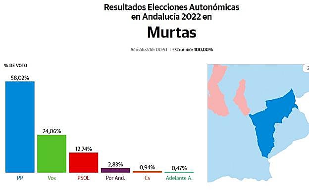 Los resultados del Partido Popular en las elecciones andaluzas han sido prácticamente inmejorables. De entre todos los votos contabilizados en la región, un 43,13% ... llevaban la papeleta del PP. Cifras extrapolables a la provincia de Granada, donde la victoria del PP también ha sido abultada. Pero, aunque en la mayoría de municipios granadinos hayan vencido los populares, hay uno en el que el porcentaje de votos ha sido significativamente mayor: Murtas.