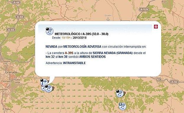 En concreto, según informa la Dirección General de Tráfico (DGT) y corrobora Emergencias 112, la nieve ha hecho que el acceso a la Hoya de la Mora por la A-395 fuese intransitable. Es decir, ningún vehículo pudo acceder a esta carretera a partir del kilómetro 32 en ambos sentidos y desde el 28 fue obligatorio el uso de cadenas. No obstante, el acceso a la estación de esquí de Sierra Nevada estuvo abierto en todo momento y sin mayores complicaciones circulatorias que las propias de una zona nevada.