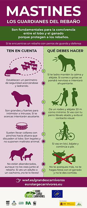 Los mastines se dedican desde hace siglos a defender el ganado frente a los lobos, los perros asilvestrados y los ladrones, pero, en realidad, cualquiera que atraviese el perímetro de seguridad que establecen alrededor de 'sus' ovejas o cabras será considerado un intruso y tratado en consecuencia. No correr, gritar o hacer gestos bruscos;no encararse con los 'guardianes' si se acercan ladrando; no romper el perímetro de guarda, sino rodear el rebaño; o atar a nuestras mascotas son algunas de las recomendaciones que incluyen los carteles de estos pueblos de Granada.