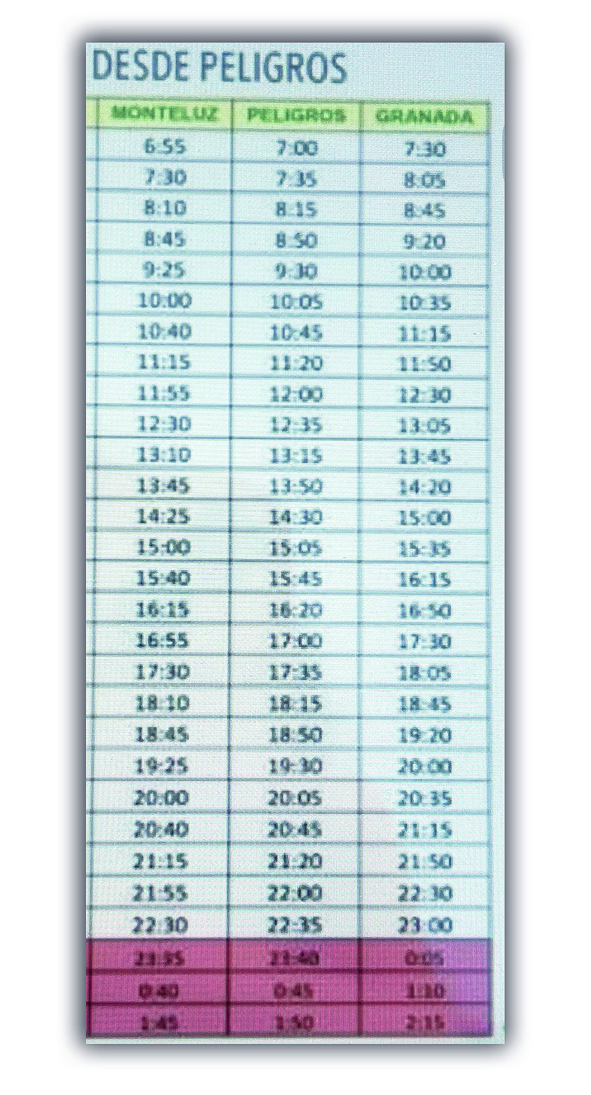 Uno comienza a preguntarse estas cosas hasta que el pasajero de al lado responde: «Es que no estás mirando bien. Ese no es el horario de los buses de verdad. Mira, te comparto la foto que yo tengo». Esa foto era un pantallazo del itinerario del bus 110 publicado por el Consorcio de Transporte Metropolitano. Una mujer con sombrero rosa fucsia, preparada para el sol que no tapa la parada del bus que espera, señala en su reloj la hora en la que llegará este.