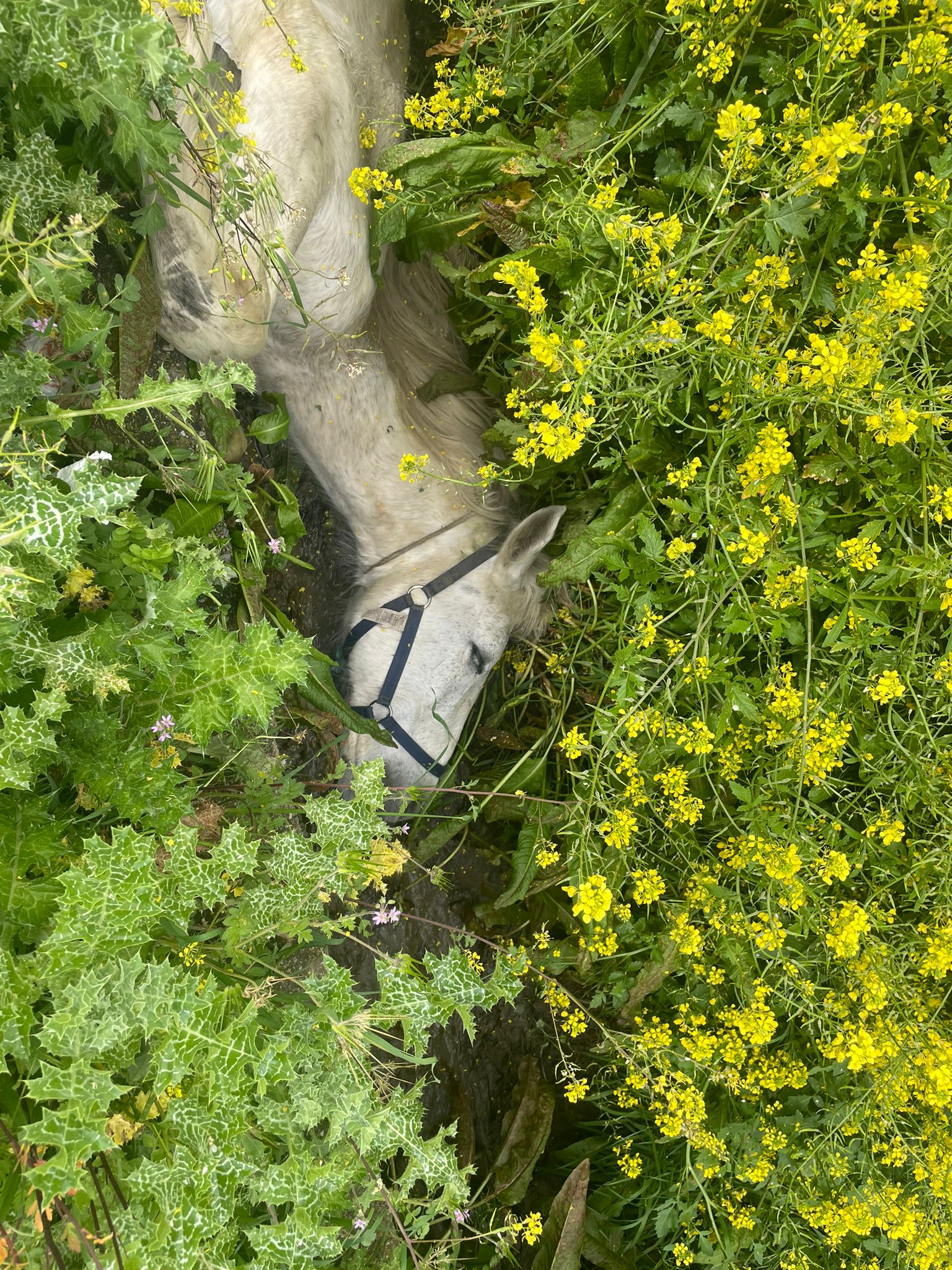 Unos instantes más tarde, la caballo estaba a salvo y se puso en pie, una señal evidente de que había superado el trance sin sufrir heridas de consideración.