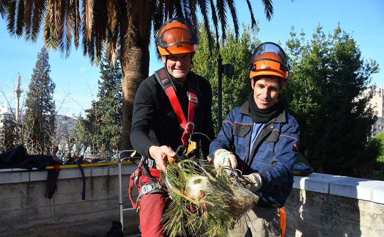 Se llama Marco Antonio Castillo Ferrer. Está a 10 metros de altura, sobre las ramas medias de un enorme pino carrasco en la entrada del ... Hospital Real, la sede del Rectorado de la Universidad de Granada. Con una larga pértiga terminada en una tijera de podar, corta la rama en la que se sitúa una gran bolsa de procesionaria, un nido donde se desarrolla la oruga de una especie altamente urticante y peligrosa para hombres y animales, para los que puede ser letal. Marco, es técnico especialista del servicio de Jardines de la UGR, encargado, junto a su compañero, Rafael Mesas Villegas, de la lucha contra una plaga muy temida en entornos urbanos, donde existe un mayor riesgo de contacto con personas y mascotas. «Desde hace tres años trabajamos en la colocación de trampas en los troncos de los pinos para que las orugas no lleguen al suelo y en la retirada, una a una, de forma manual, de las bolsas de procesionaria que localizamos en los árboles», afirma Marco, que como especialista en tratamiento en altura, es el que trepa a las copas de los árboles, algunos de ellos de más de 15 metros.