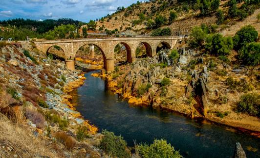 Buscamos una única e impactante visión de los colores y la singularidad del río Odiel. Viajamos hacia Zalamea la Real y, desde esta localidad, seguir por la carretera hacia Calañas, entre encinares y monte bajo, que conduce hacia un viejo puente de piedra que, en una cerrada curva, sirve de paso sobre el río Odiel. Es la puerta de acceso a un universo desconocido. El Odiel se ensancha antes de pasar bajo el puente, genera zonas de riberas encharcadas de colores amarillos entre rocas ribeteadas de rojo. El agua sortea antiguos pilares de puentes romanos y árabes. Al otro lado del puente, el río baja caudaloso, encajado en un cauce estrecho de tierras rojas y ocres, cobrizas y, en el centro, el agua adquiere un intenso color verde. Sendas y veredas se internan en la ribera, discurren entre los bosques de pinares, que se asoman a un río en busca de minas y molinos.