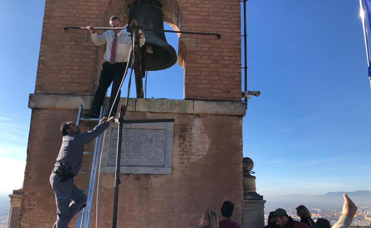 La reparación se llevó su tiempo. Algo más de tres cuartos de hora. Primero hubo que encontrar una escalera que permitiera arribar hasta la esquila. «Cuando llegó, transcurridos cincuenta minutos, la gente rompió en aplausos», cuenta Juan Miguel. Después hubo que reparar la soga con cinta americana. Y por último comprobar que el sistema funcionaba como dios manda, «una prueba que a pique estuvo de dejar sordo al señor que subió a la campana para arreglarla», relata Juan Miguel. Mientras tanto, la cola salía ya del recinto de la Alcazaba.