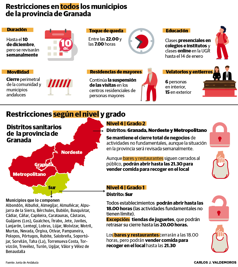La Junta de Andalucía amplía hasta el próximo 10 de diciembre el cierre de los municipios, el toque de queda entre las 22 y las ... 7 horas y la clausura de bares, restaurantes, centros deportivos y comercios no esenciales en la provincia. Habrá una excepción:el distrito sanitario Sur, en el que la incidencia del coronavirus es muy inferior a la del resto de Granada. En este área, en la que están incluidos 43 municipios de la Costa Tropical y la Alpujarra, los establecimientos y negocios de hostelería podrán abrir hasta las 18 horas desde mañana martes.