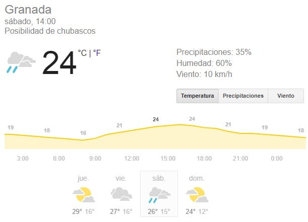 De acuerdo con la Agencia Estatal de Metorología (AEMET), el viernes se presenta nublado en Granada, donde las temperaturas oscilarán entre los 16 grados de mínima y los 27 de máxima. No obstante, a pesar de las nubes, las probabilidades de lluvia serán bajas, llegando únicamente al 23% en torno a las nueve de la noche.