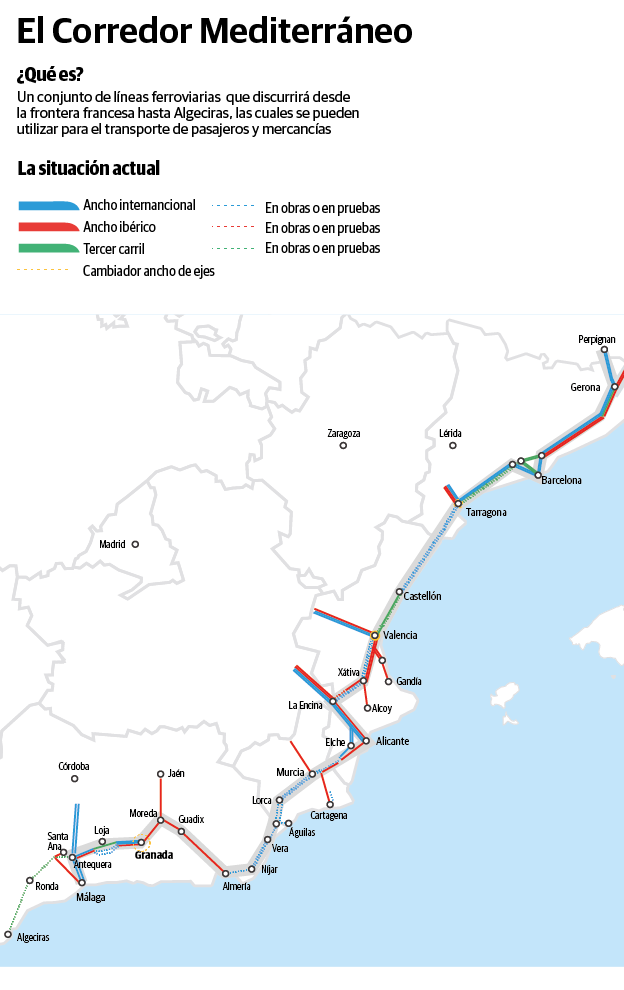 Los informes periódicos de la plataforma empresarial Quiero Corredor muestran un mapa en el que todos los tramos del Levante están en obras o en proyecto. Solo hay uno que está en estudio: el Almería-Granada. También es el único en el que no hay año previsto para la finalización de obras. Sí avanza el tramo Granada-Antequera, que depende de la Variante de Loja, que sí tiene consignación presupuestaria.