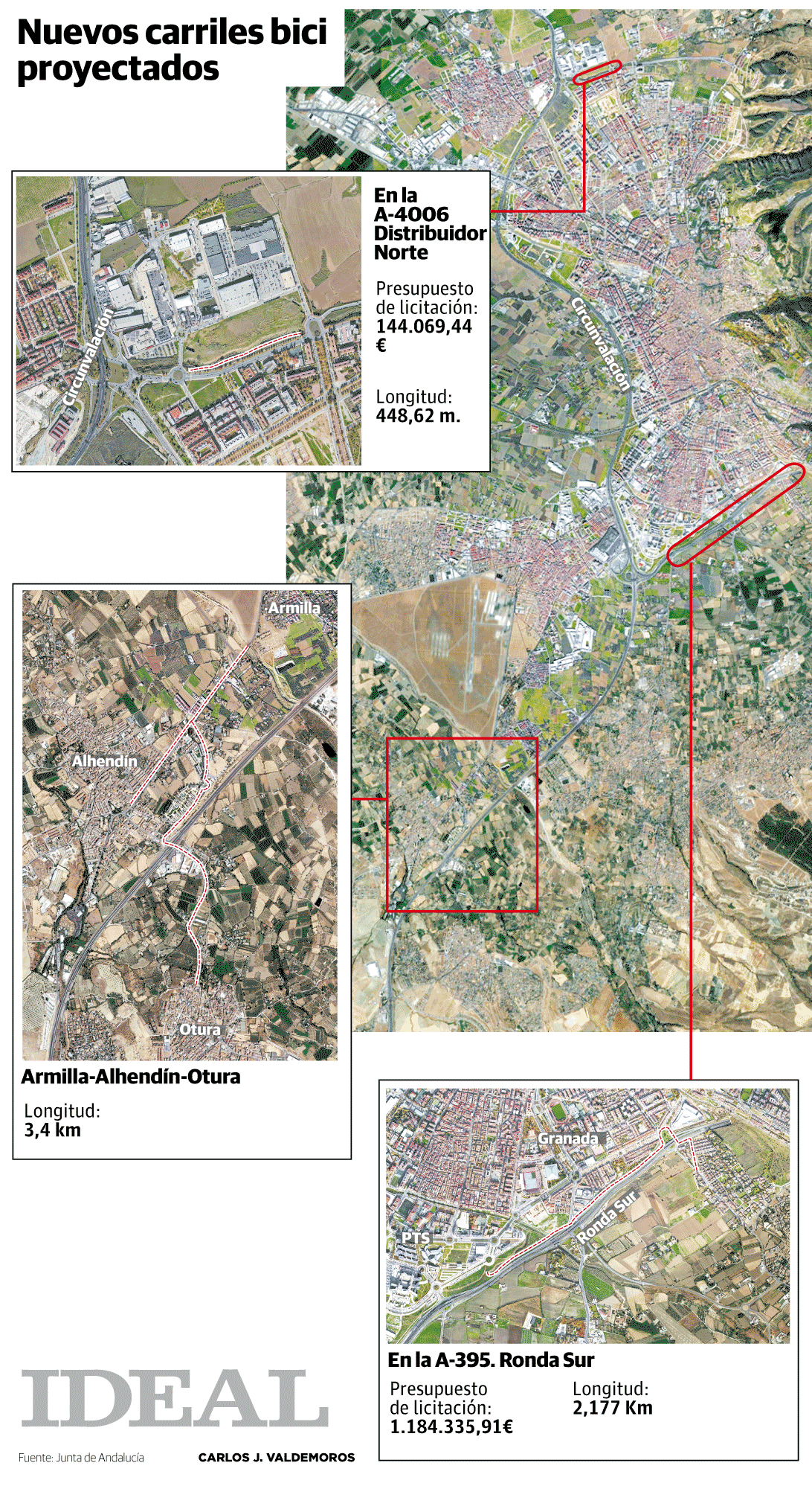 En cuanto a los tres nuevos carriles bici, antes de final de año comenzarán las obras de los 500 metros que faltan para completar el vial ciclista existente en el Distribuidor Norte de Granada (A-4006). Se trata de medio kilómetro de carril bici necesario e imprescindible para llegar a la segunda rotonda de acceso al centro comercial Granaita, en el término municipal de Pulianas.