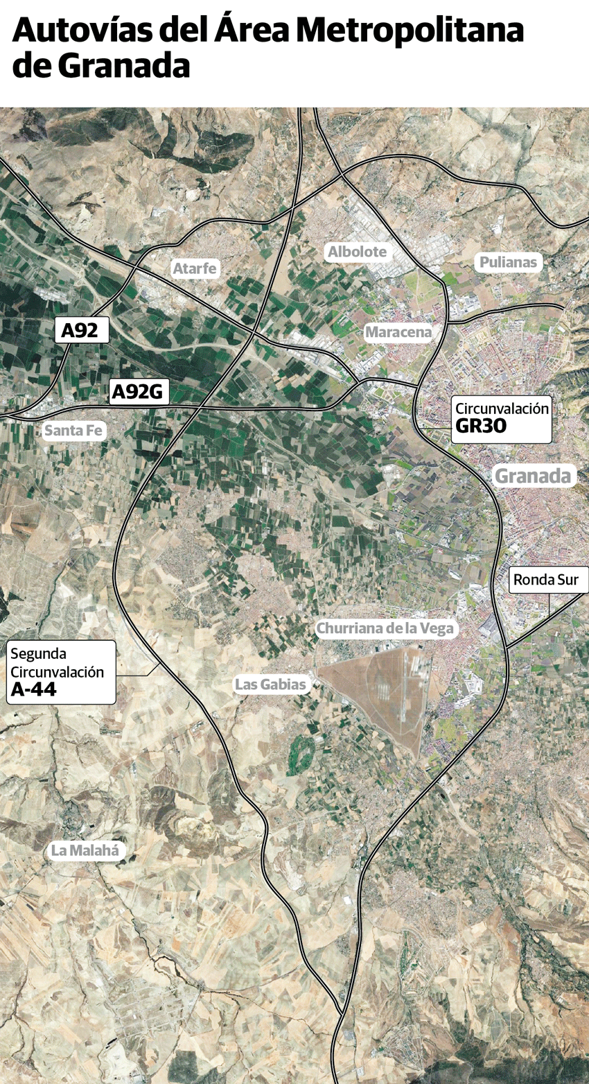 Entretanto, siguen en marcha algunos planes para mejorar la movilidad metropolitana. La Junta de Andalucía adjudicó en mayo el proyecto para la ampliación del metro de Granada por su extremo sur. La Consejería de Fomento anunció también una inversión de 25 millones para conectar la A-92 y la variante exterior. Además, este año el Gobierno ha puesto en marcha los trámites para enlazar Vegas delGenil con la GR-30, lo que daría permeabilidad al municipio pero apenas influiría en los flujos entre poblaciones en expansión como Armilla, Churriana y Las Gabias.