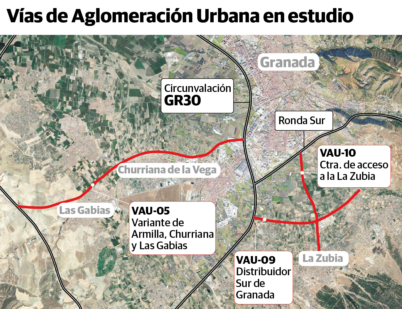 Ya se ha adjudicado el proyecto de la VAU-5, que conectaría estos municipios con la A-44 y la GR-30, siendo un eje de unión entre las dos autovías. En breve se licitará la VAU-9, que será un vial verde con franja de masa forestal, carril ciclopeatonal y bus VAO para beneficiar el transporte público. Por último, se está redactando el proyecto para la conexión de la carretera de la Diputación hasta La Zubia, la VAU-10. Se prevé una plataforma reservada para bus y dará continuación al carril bici. Su presupuesto ronda los 2,5 millones de euros. De este modo, la administración autonómica ha 'rescatado' algunos de los viales que se proyectaron en el Potaug de 1999, un documento concebido para ordenar el crecimiento delCinturón que contemplaba 11 carreteras de alta intensidad. Solo se construyó una, el distribuidor norte que enlaza Almanjáyar con la entrada a Jun. Varios grupos ecologistas se han opuesto, en los últimos años, a este tipo de proyectos que a su juicio ponen en riesgo la supervivencia de la Vega de Granada.