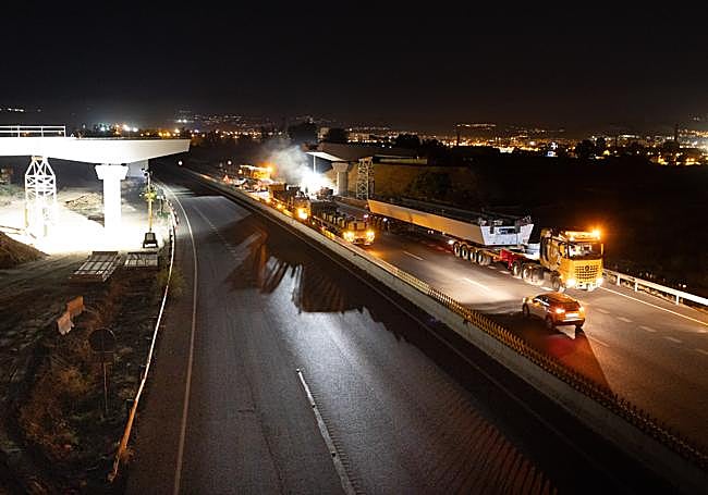 El viaducto que sobrevuela la A-92G se asienta sobre unos terrenos agrícolas y de vega que han complicado aún más el proyecto y ha obligado a realizar cimentaciones que se hunden hasta 29,5 metros por debajo del terreno, los mismos que necesitaría un edificio de diez plantas. Fuentes del Ministerio de Transportes y Movilidad explicaban a IDEAL la compleja operación de anoche, que se centró en la colocación de la viga número tres, la pieza central de las cinco que componen el viaducto. Las vigas de entre 20 y 30 metros de longitud se fabricaron en Soria y llegaron hasta la obra en Granada con transporte especial por carretera. Las cuatro de los laterales, con un peso de unas cien toneladas, quedaron colocadas en los días previos mientras que anoche se izó la gran pieza central de 154 toneladas.