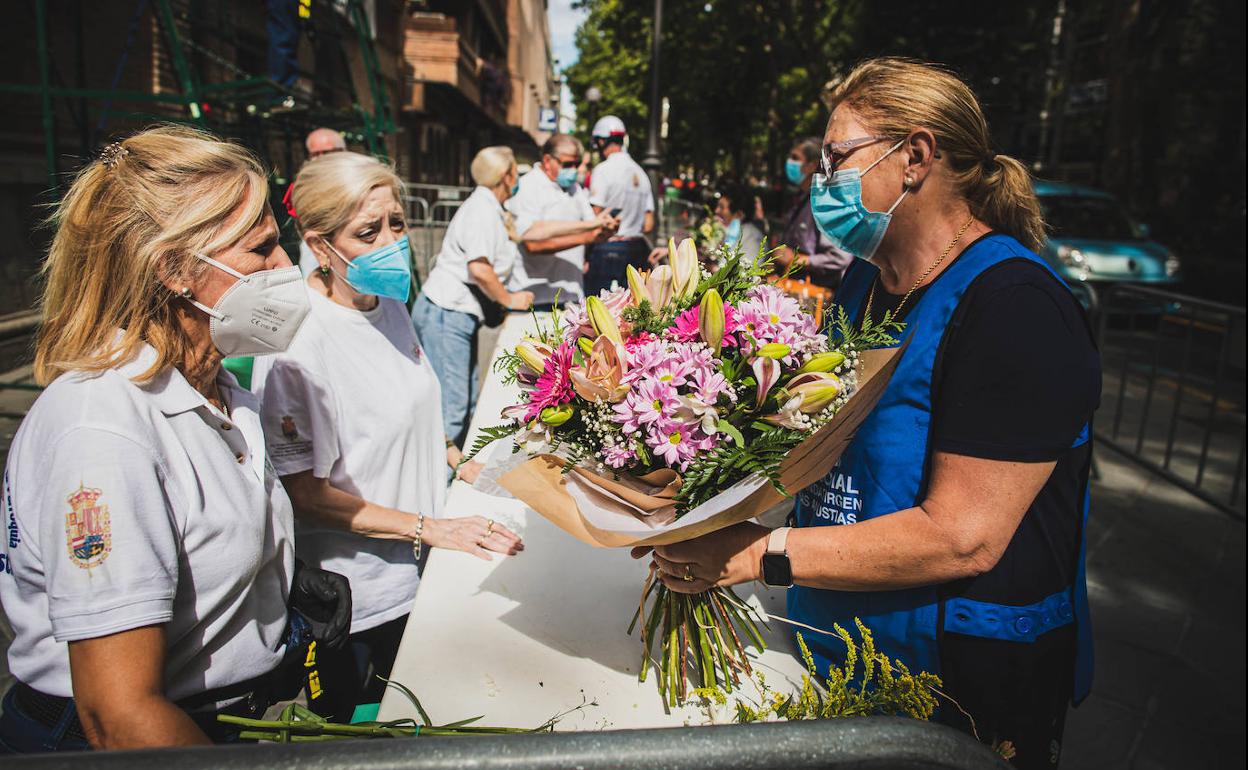 Mientras, en el templo, fueron tomando color los cuadrantes superiores de los paneles recuperados este año para colocar las flores, de todos los tipos y tonalidades, si bien el trasiego de granadinos por la mesa de ofrenda fue decayendo hasta prácticamente pausarse al inicio de la misa, pasado ya el mediodía. La celebración no fue como solía ser; de hecho, la escena distó mucho de la que habría tenido lugar antes de que la covid-19 interrumpiera lo que se conocía como normalidad, pero se le asemejó. «Las personas están respondiendo bastante bien. Hay que tener en cuenta que hemos pasado un año y pico con toda España paralizada y, a veces, cuesta un poco empezar, pero Granada se vuelca con su patrona.», indicó Ángel Luis Vázquez, decano del Real Cuerpo de Caballeros Horquilleros.