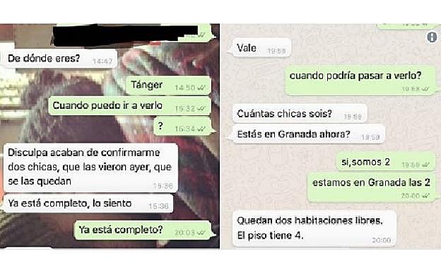 Según recoge el mensaje, la primera captura responde a la conversación mantenida por una “estudiante y migrante” que busca piso en Granada y una casera. En ella se puede leer cómo la segunda cuestiona por la nacionalidad de la primera. Al conocer que era de Tánger, la propietaria mostró sus “disculpas” y le informó que el piso estaba “completo”.