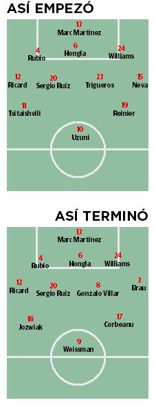 Guille mantenía la duda de Ignasi Miquel y no pudo contar con los lesionados Insua, Zidane y Boyé. Martin Hongla, que actuó en la defensa, y Myrto Uzuni, como referencia en ataque, fueron los cambios del entrenador del Granada con respecto al Elche. El dibujo del sistema táctico facilitado por el club le colocó en la zaga, aunque podía ejercer de mediocentro tras Sergio Ruiz y Manu Trigueros. Del 3-4-3 al 4-3-3, con Myrto Uzuni en punta por Shon Weissman como el otro cambio en ataque. En la segunda mitad, nada varió de pizarra. El entrenador sevillano del Granada recibió muy pronto gritos de disconformidad en la grada hacia su persona. Está en una situación complicada.