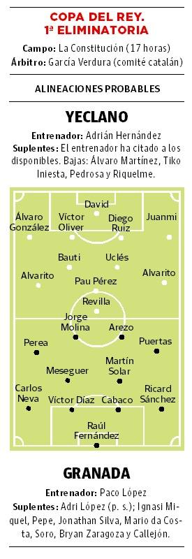 Paco López toma la alternativa con el Granada en una plaza con trampa ante un novillo resabiado como el Yeclano. Los rojiblancos están en Segunda ... división y los murcianos, en la 2ª RFEF, un par de categorías más abajo, pero la mística de la Copa del Rey acerca lo que parece lejano e iguala la contienda por la enorme motivación del modesto y por el hecho de ejercer de anfitrión en una eliminatoria a partido único. No es el mejor contexto para el debut del técnico valenciano pues tiene poco que ganar y mucho que perder. La lógica inclina a recordar la superioridad del Granada, pero las muchas bajas que acumula, sobre todo en el centro del campo, y el hecho de empezar con un guion nuevo desde el banquillo aventuran una situación de incertidumbre en el estadio de la Constitución.
