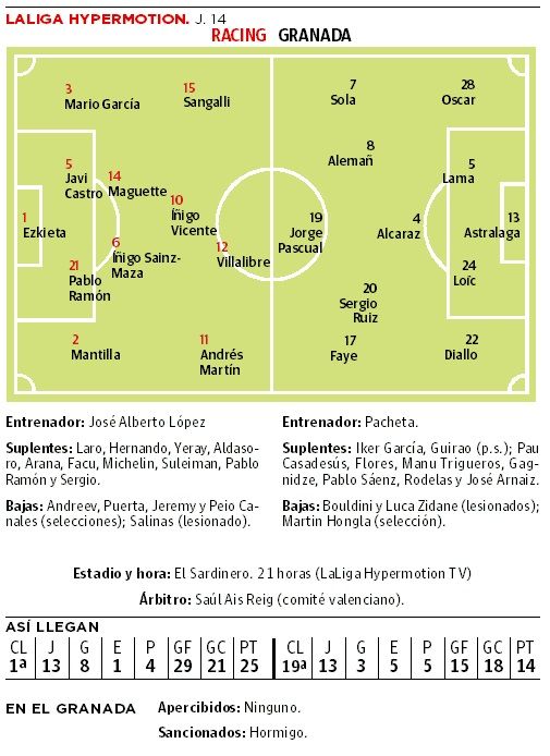 La experiencia de Astralaga, no obstante, fue una derrota con el Leganés en Liga, en aquel encuentro en el que Pacheta buscó un cambio de rumbo relevando a Luca. La idea solo le duró un encuentro y Astralaga se sumió de nuevo en el ostracismo, aunque mantuvo su condición de internacional español sub 21, al menos hasta esta ventana. Tras sacar adelante la eliminatoria copera ante el Roda, le toca salir al paso del encuentro ante el líder de Segunda división. Un Racing con unos datos goleadores admirables, pero que está afeitado por las bajas de Jeremy y Peio Canales. Precisamente, por el llamado 'virus' FIFA que 'transmiten' las llamadas de los combinados nacionales.