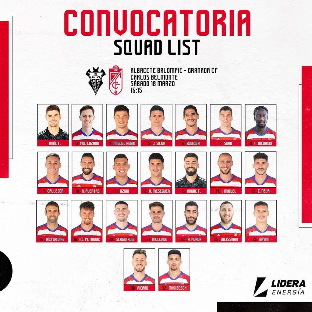 Erick Cabaco es la baja por sorpresa de la convocatoria del Granada en el desplazamiento a Albacete. Es probable que el defensa uruguayo fuera el ... jugador mencionado por el técnico Paco López en rueda de prensa que se encontraba con molestias. Finalmente, ha sido descartado de una lista a la que regresa el portero André Ferreira. Adri López irá con el filial para su cita del domingo frente al Sevilla Atlético.